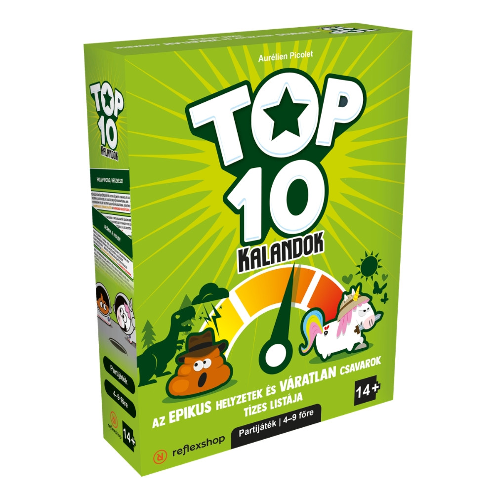 Az új Top 10-ben tematikus kalandokat kell átvészelniük a játékosoknak. Ebben a kooperatív játékban egy kártyán öt egymásra épülő történet van, és minden szintnél a játékosoknak egy-egy szituációt, kérdést kell elhelyezniük egy 1-10-es skálán. Mit találnak a titkos barlangban a haszontalan dologtól a mérhetetlen kincsig? A válaszokat a mesélőnek kell sorrendbe raknia, és ha sikeres a skála, jöhet a következő kaland! Izgalmas, humoros hangvétel, egy zseniális frissítése a már klasszikusnak számító Top 10-nek!