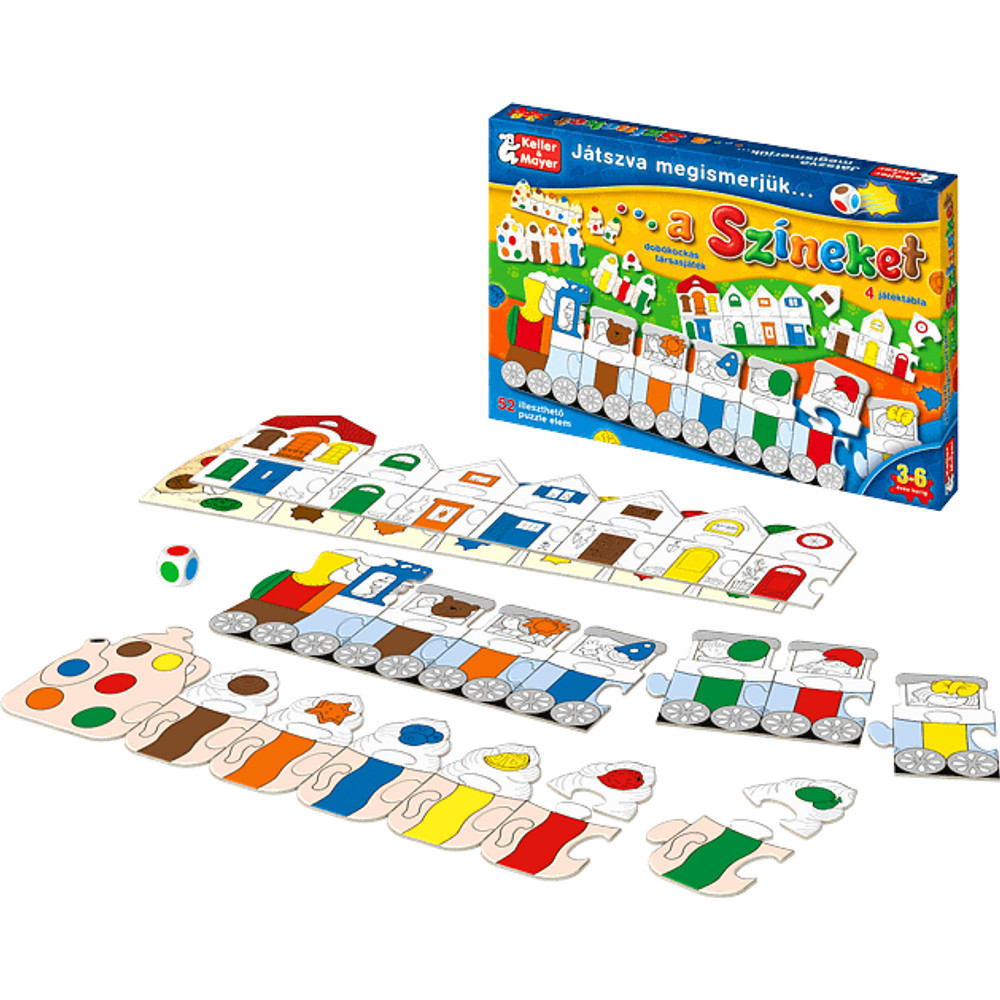 A doboz 52 db illeszthető puzzle elemet és egy színes dobókockát tartalmaz, 3 éves kortól ajánlott.