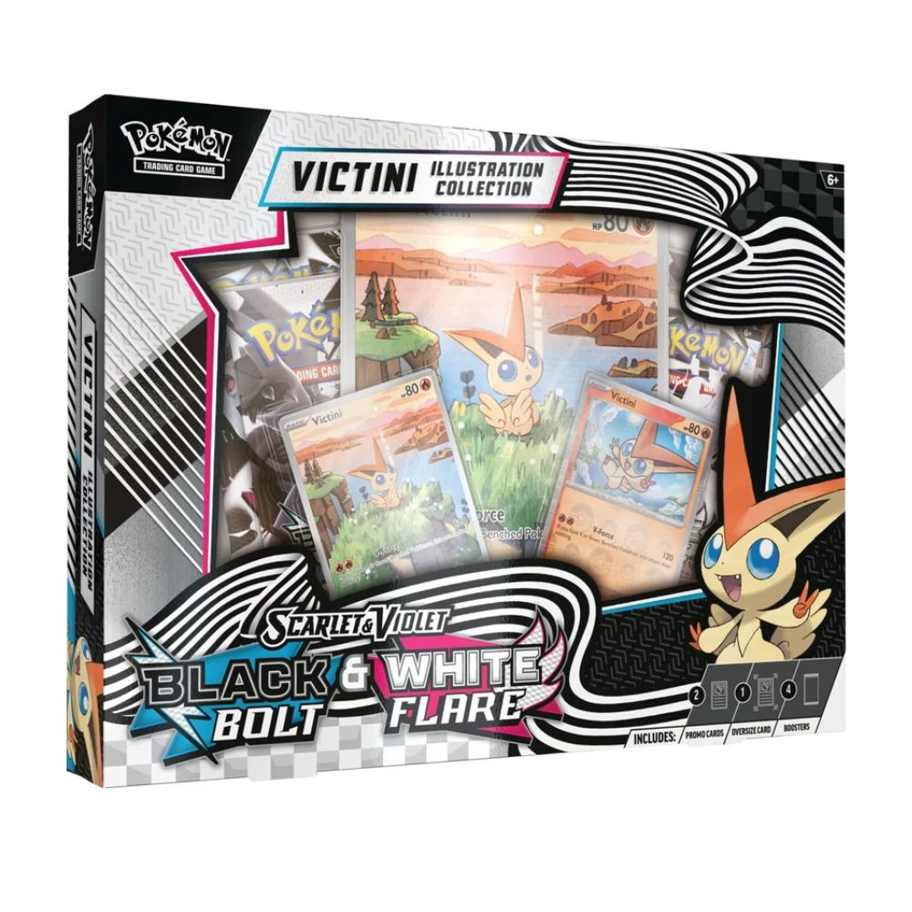 A Pokémon TCG: Unova Victini Illustration Collection tartalma: 1 db teljes illusztrációs (full-art) fóliás promókártya Victinivel 1 db prémium, párhuzamos fóliás kártya Victinivel 1 db óriás méretű, illusztrációs ritkaság stílusú fóliás promókártya Victinivel 2 db Pokémon TCG: Scarlet & Violet – Black Bolt booster csomag 2 db Pokémon TCG: Scarlet & Violet – White Flare booster csomag 1 db kódkártya a Pokémon TCG Live online játékhoz
