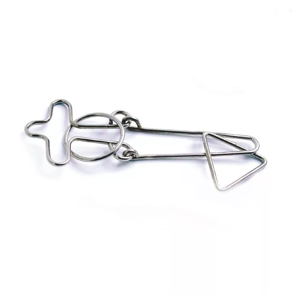 A Racing Wire Puzzle 08 feladata egy fémgyűrű kiszabadítása a szerkezetből. A kereszt alakú elem, a hosszú vezetőszár és a háromszög formájú vég együtt olyan útvonalat alkot, ahol a gyűrű könnyen elakad. A megoldáshoz pontos kézmozdulatokra és jól átgondolt sorrendre van szükség, mert egy rossz irány gyorsan visszavisz az elejére. Letisztult, masszív ördöglakat, amely addig nem enged, amíg rá nem jössz a helyes megoldásra.