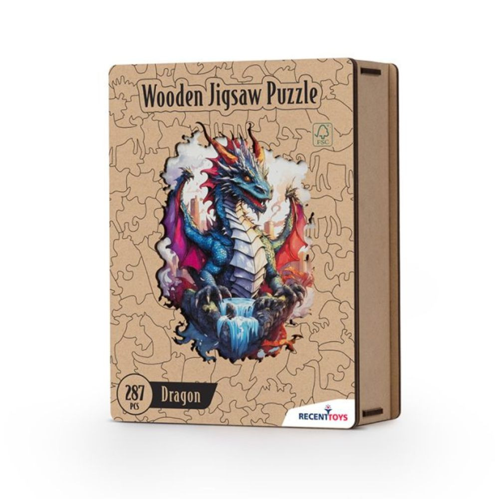 A faelemek kellemesen súlyosak, stabilan illeszkednek, és kézbe véve is érződik a minőség. Ahogy a kép összeáll, a sárkány alakja egyre karakteresebbé válik: a pikkelyek mintázata mély, a tekintet szinte átszúrja a hátteret, a test vonalai pedig dinamizmust és erőt sugároznak. A kész puzzle önmagában is figyelemfelkeltő dísztárgy, amelyet könnyű elképzelni a falon vagy egy polcon — bárhová teszed, erős hangulatot visz a térbe.