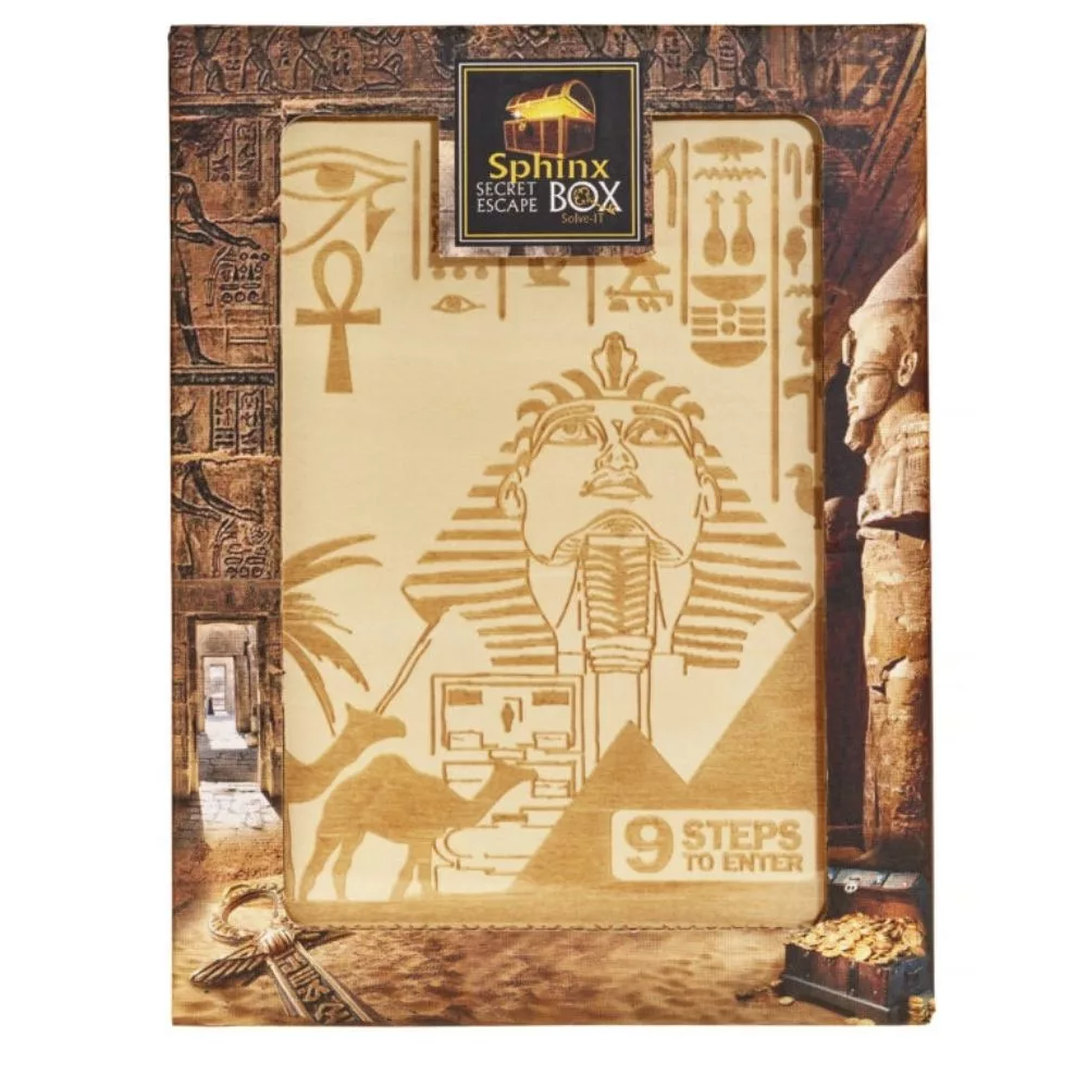 A Sphinx Secret Escape Box már a megjelenésével is egy régi, homokba temetett civilizáció hangulatát idézi. A sárgás-barnás faárnyalatok, a hieroglifaszerű minták és a rejtélyes, ókori díszítések mind arra utalnak, hogy ez a doboz több mint egyszerű puzzle: egy apró ereklye, amely mintha maga is egy elveszett sírkamrából került volna elő. A finom illesztések mögött pedig ott rejtőzik az a logikai mechanika, amely csak a türelmes felfedezők előtt engedi megnyílni titkait.