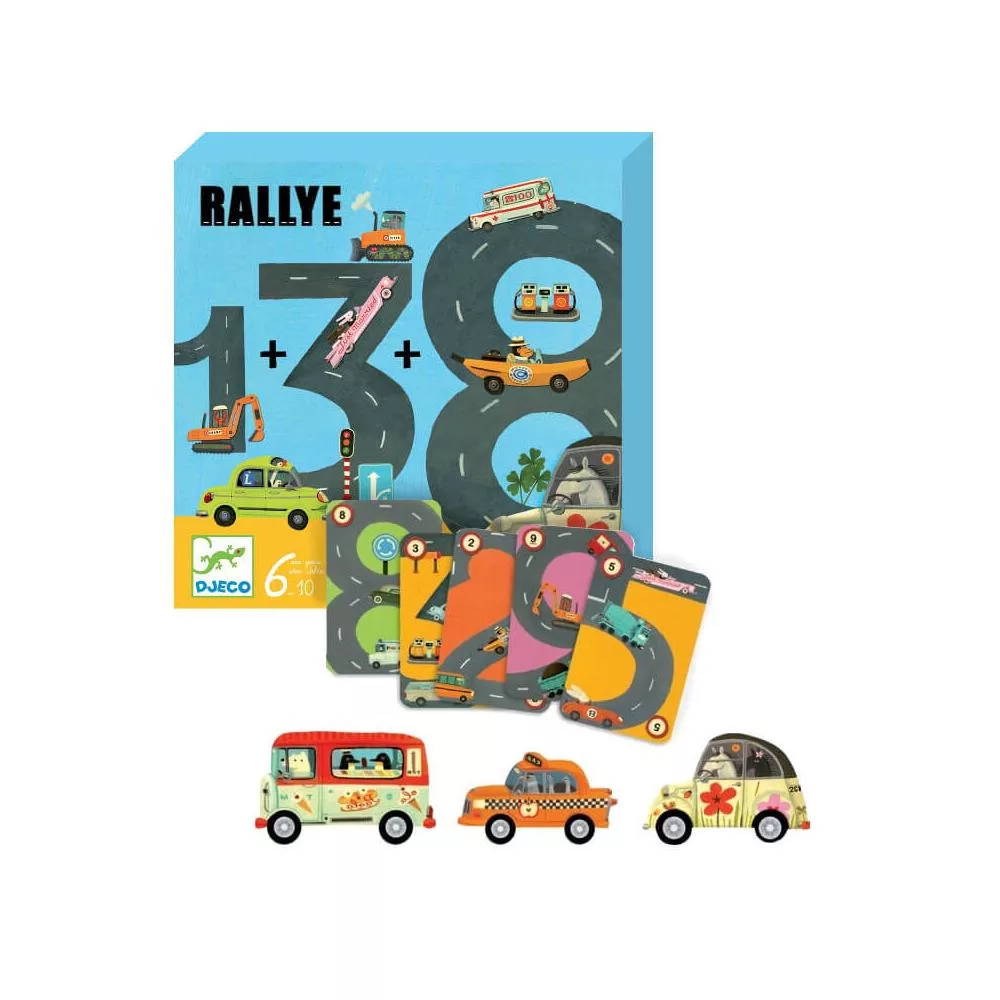 A Djeco Rallye társasjátékban matematikai képletek alapján kell megoldani feladatokat, hogy előre juthassunk. A gyártó az izgalmas, akár ezerszer is végigjátszható futamokkal az 5-10 éves korosztályt célozzák meg, azon belül is értelemszerűen a fiúkat.