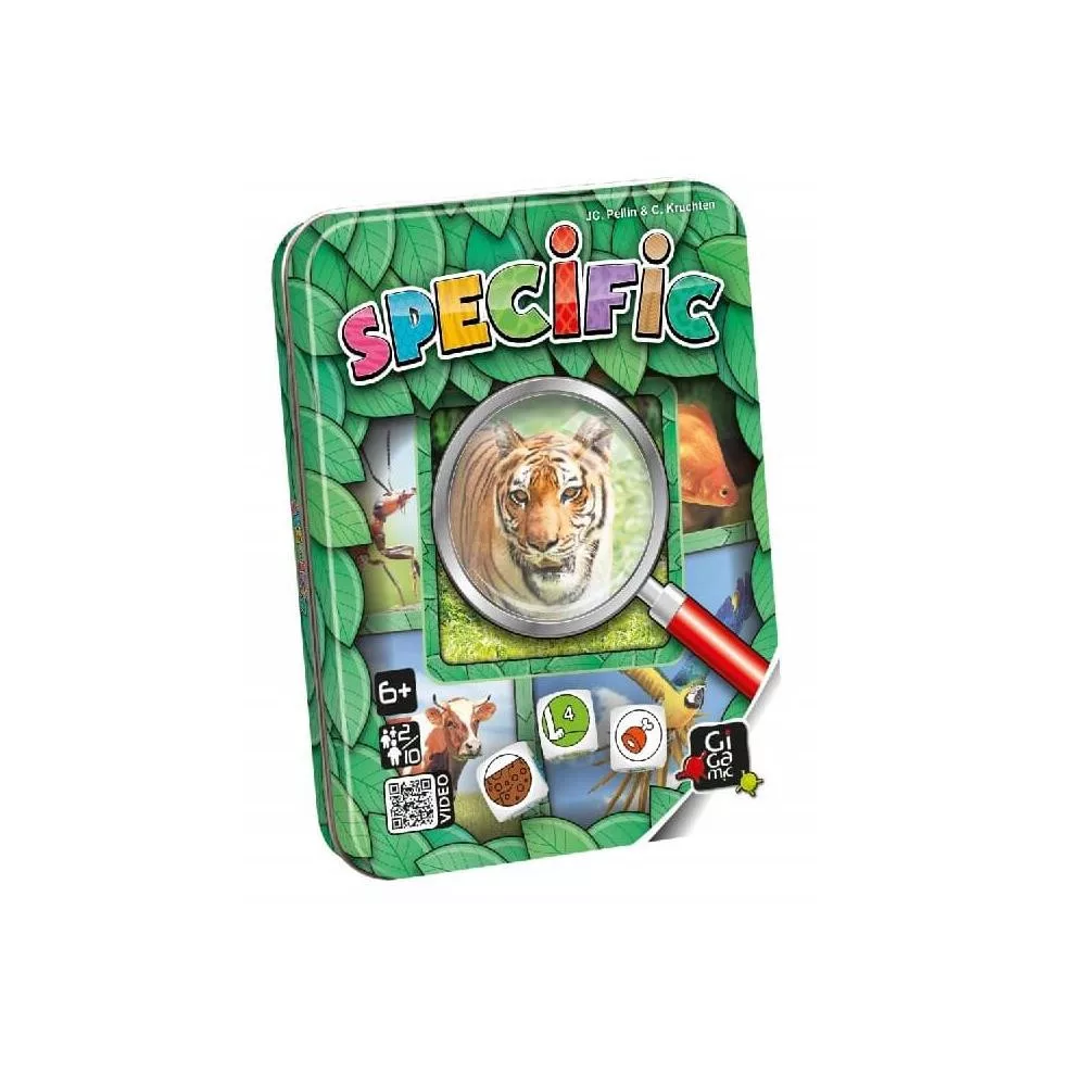 Nevezz meg egy szárazföldi ragadozót, aminek négy lába van! Ez még könnyű volt, de vajon a következő dobásnál milyen jellemzőkkel rendelkező állatot kell majd megnevezned? A Specific egy fergeteges oktató-fejlesztő társasjáték, ahol három különleges dobókocka határozza meg, hogy milyen tulajdonságú állatot kell találnod a lapok között. A feladat nehezebb, mint gondolnád! Te vajon gyorsabb leszel társaidnál?