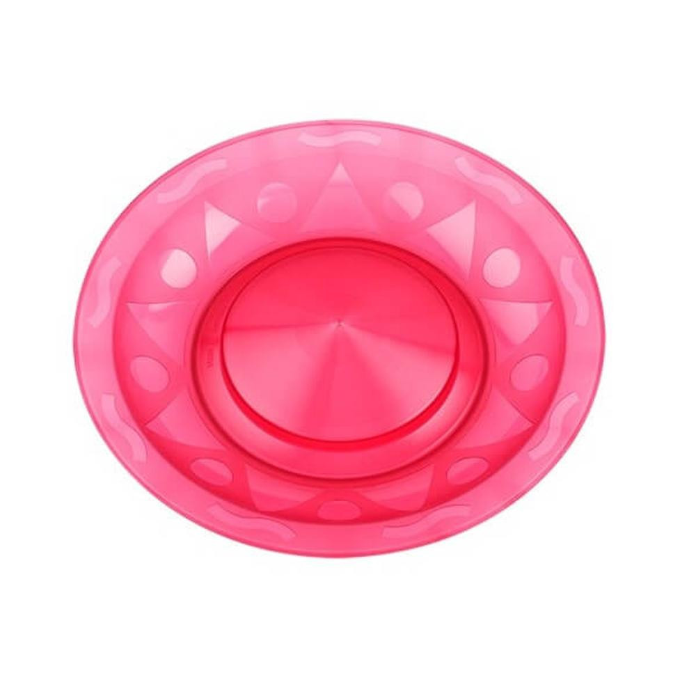 A tányér alján található egy kör alakú bemélyesdés, aminek a szélén vagy a közepén is el lehet helyezni a botot, amivel pörgeted a tányért - így tudod befolyásolni a tányér dőlési szögét. Puhább tapintású, színe kissé átlátszó. A szélén mértani minták szerepelnek, így megfigyelheted, hogy milyen gyorsan forog a tányér a játékod közben.